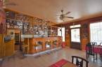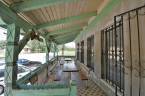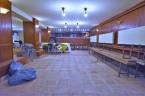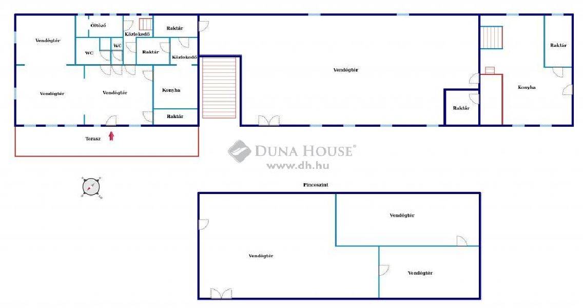 A saroktelken elhelyezkedő ingatlan egyik oldalán árnyékos terasz fut végig, melyről a világos étterembe lépünk be, illetve ezen a szinten található egy hatalmas különterem is, ami fénykorában esküvők, rendezvények színhelye volt.