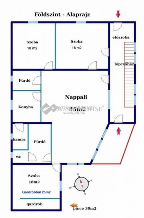 A földszint 147m2, óriási terek jellemzik. A ház alatt egy 30m2-es pince is ki lett alakítva.