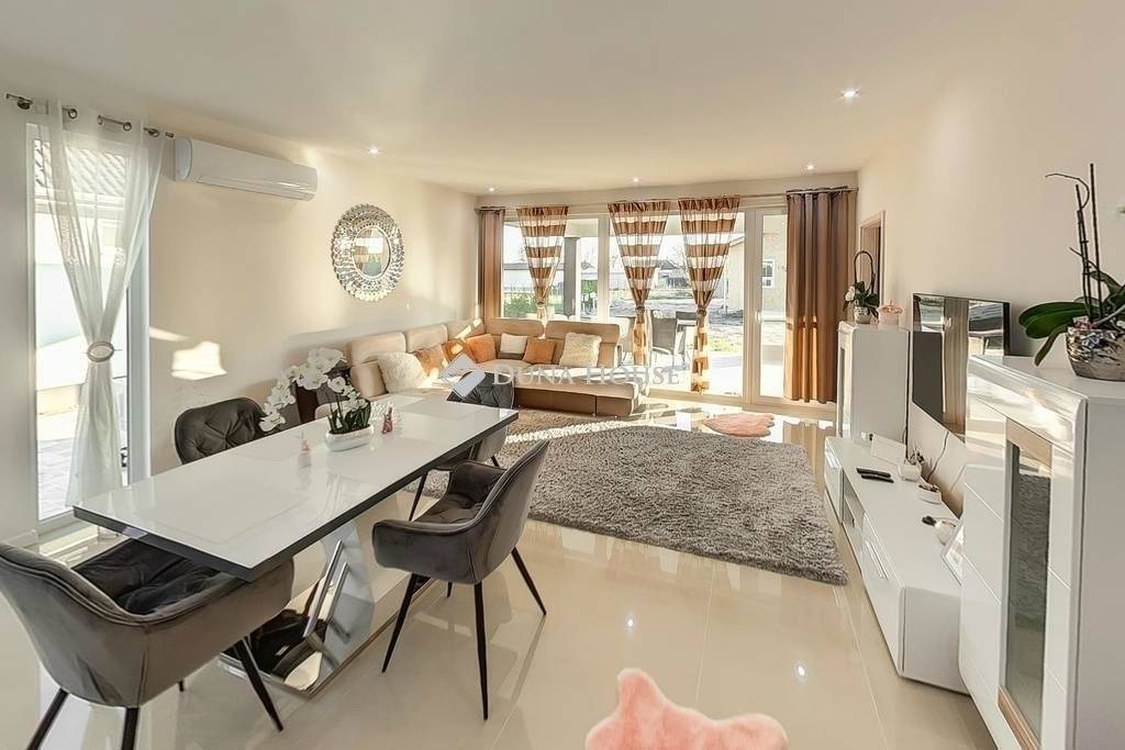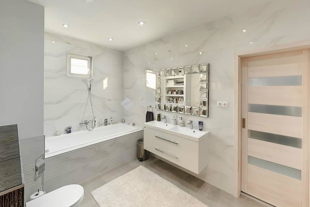 Az 585 m2-es összközműves, aszfaltozott utcában levő területre a tulajdonos egy 124 m2-es nagy nappalis, két igényes lakosztállyal (hálószoba-gardrób-fürdő-wc) rendelkező otthont álmodott meg egy hatalmas 41 m2-es fedett terasszal, mely igény szerint beépíthető, így adva helyet akár egy további szobának.
