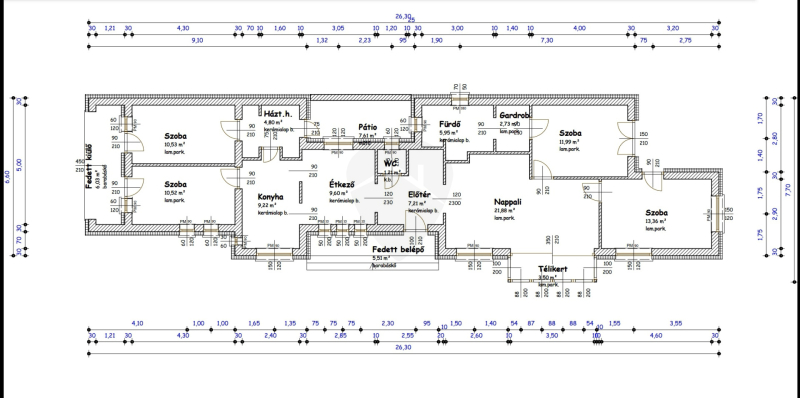 Az ingatlan elosztásának egyik lehetősége a feltüntetett alaprajzon részletesen megtalálható, a belső válaszfalak az új tulajdonos igényei szerint módosítható.