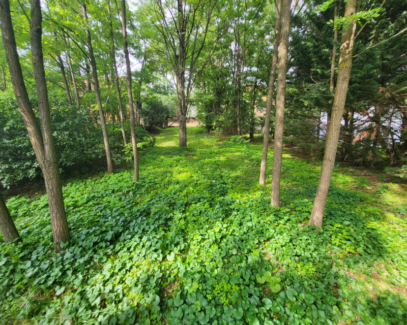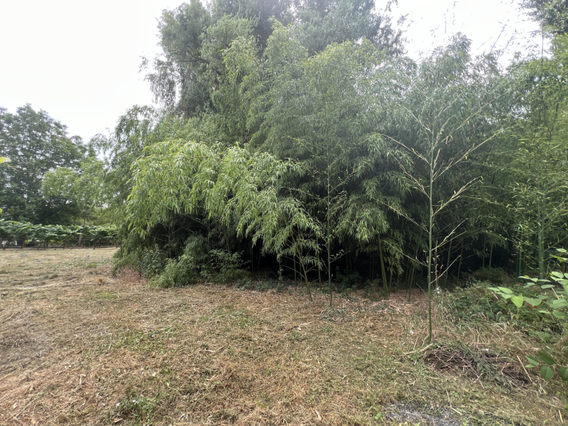 Telek végében egy bambusz erdő, sziklakerttel, kis tóval.