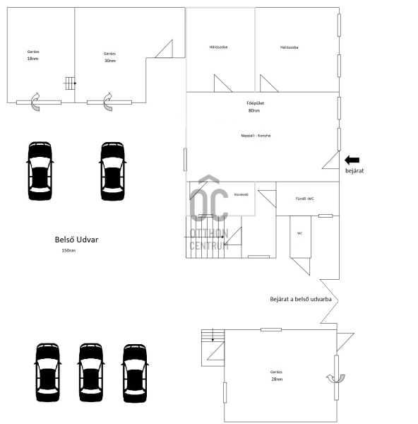 Megközelíthető az átrium üzletház felől. Az utcafronti épület (80nm), tartalmaz tágas nappalit amiből két nagy méretű szoba nyílik. Nagy méretű közlekedőt egy kisebb helységgel, valamint három garázst (melyek együttes alapterülete 76nm) és egy 180 négyzetméteres belső udvart mely legalább 3 autó tárolására alkalmas.