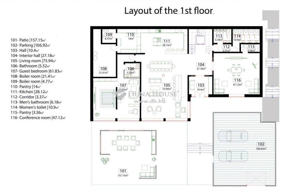 A vendégek számára az utcán 3 autónak van parkolási lehetőség, és az udvaron egy fedett parkoló is kialakítható, amely további 3 autót képes befogadni, összesen 100 m2-en. A fedett parkoló padlófűtéssel rendelkezik.
