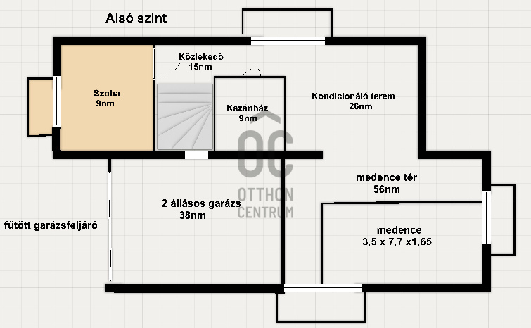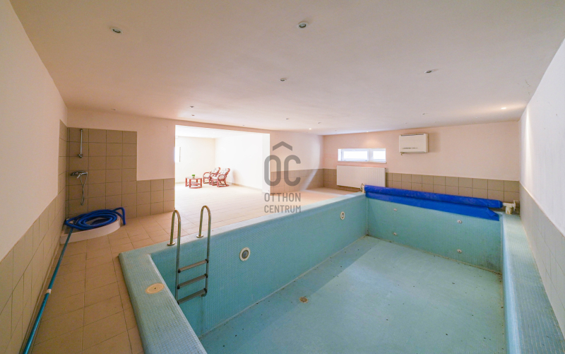 -alsó szint: 2 állásos garázs, fűthető bejáróval, medencetér 3,5 m x 7,7 m-es, 165 cm mély fűthető medencével, alsó szinti szoba, kazánház