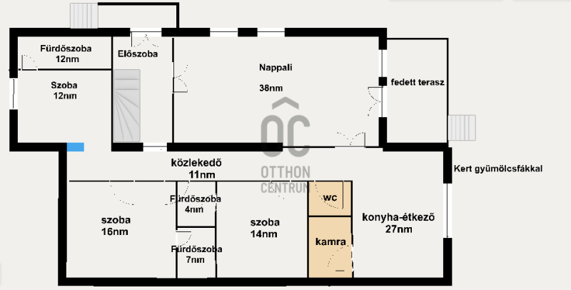 -földszint: nappali, 3 hálószoba, minden szobához fürdőszoba, nagyméretű konyha étkezővel, kamra, gardrób, fedett terasz