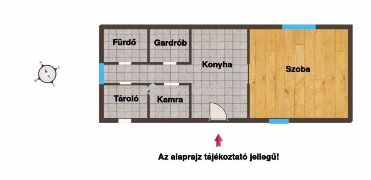 A házban a lakószobán, konyhán és zuhanyzós fürdőszobán kívül található három praktikus tárolóhelyiség - a kamra bepolcozva, a jelenleg gardróbnak használt helyiség pedig beépített szekrénnyel várja az új tulajdonost.