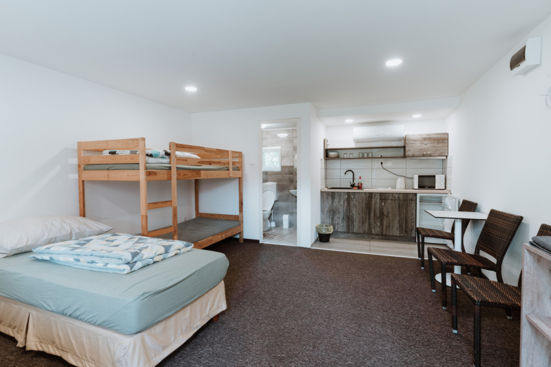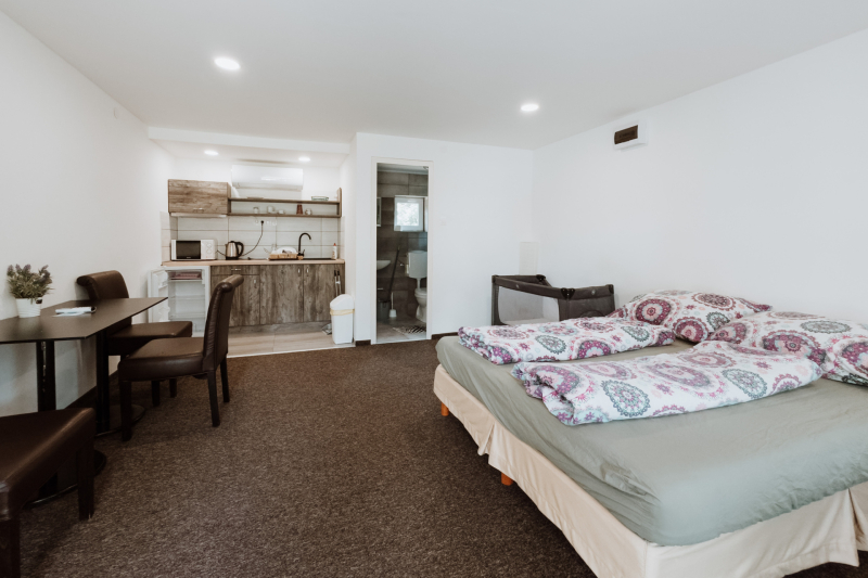 Jelenleg 22 apartman, 197 m2 rendezvényterem, fedett teraszos kávézó, külön épületben tároló raktár.
