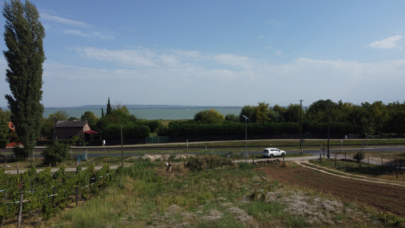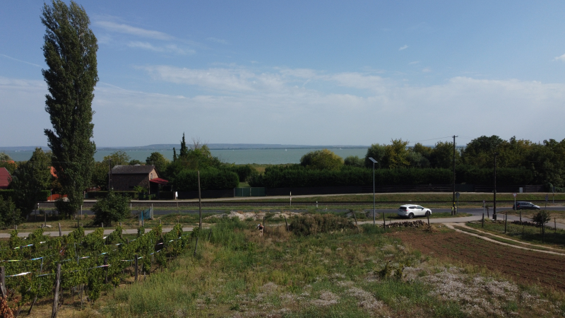 A Balaton víztükre már a telek alsó részén is látható, de a majdani épület felső szintjéről zavartalan panoráma nyílik majd, amelyet hamarosan drónfotókkal láttatunk a hirdetésben.