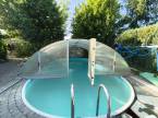 Az udvar végében kültéri fedett medence, szauna, grillező, bográcsozó lett kialakítva.