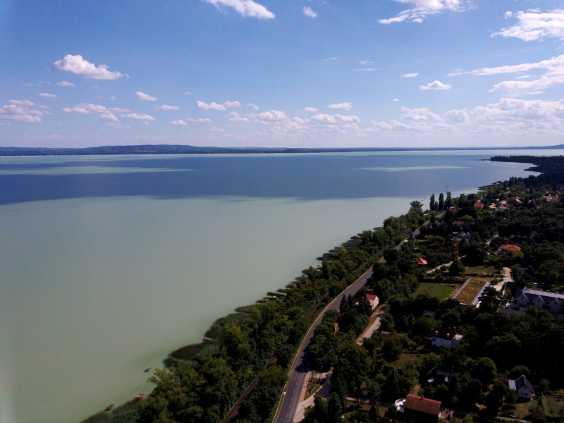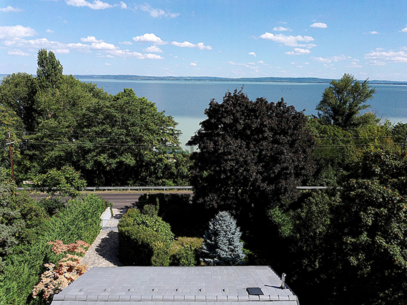A földszinten fürdőszoba+wc, egy amerikai konyha és nappali, valamint egy gardrób helyiség is található. Ehhez a részhez kapcsolódik egy balatoni panorámával rendelkező terasz.