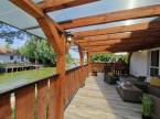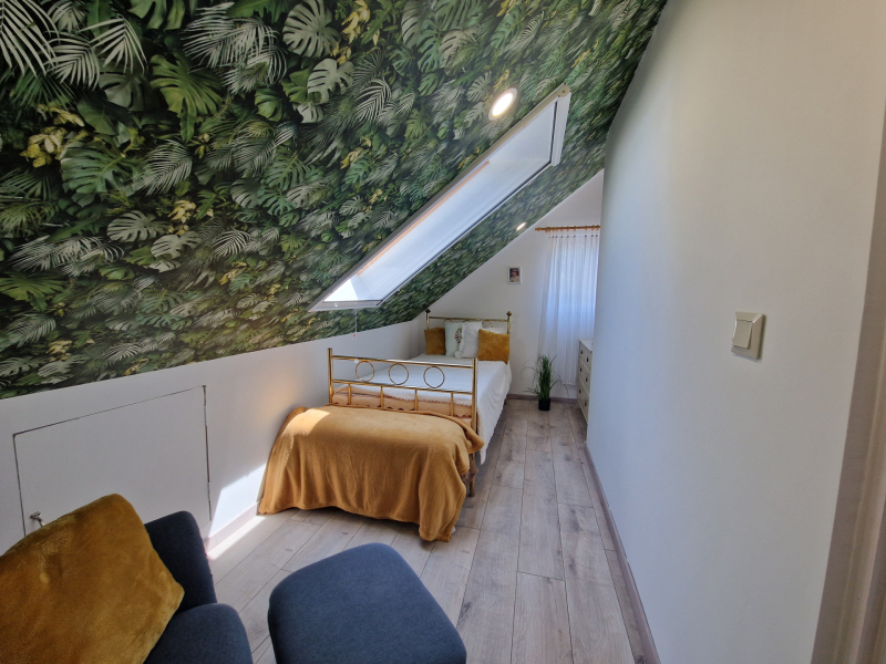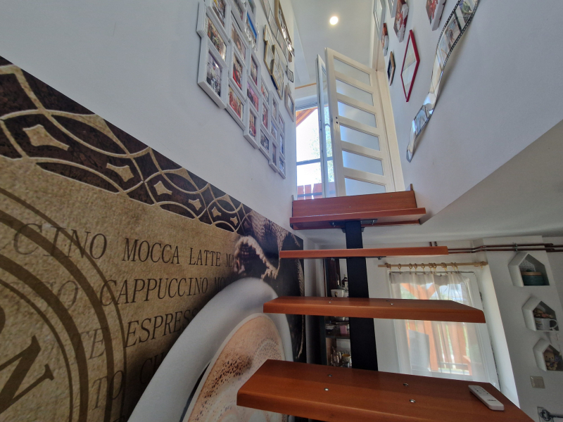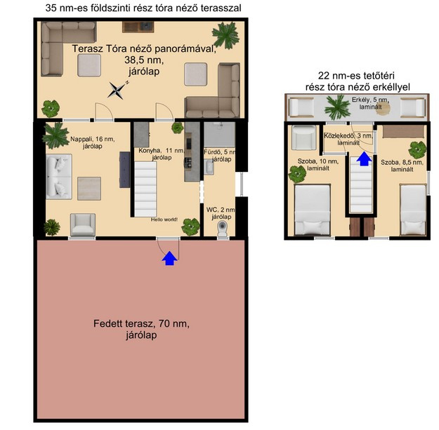 -2 szintes elosztás: alsó szinten nappali, konyha, zuhanyzós fürdőszoba, WC, két fedett terasz; a tetőtérben 2 hálószoba és egy panorámás erkély
