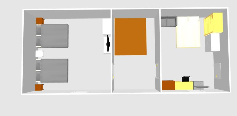 Az alsó szinten egy konyha-étkező, egy nappali, egy fürdőszoba, egy kamra, valamint egy borospince található. Az emeleten két hálószoba került kialakításra.
