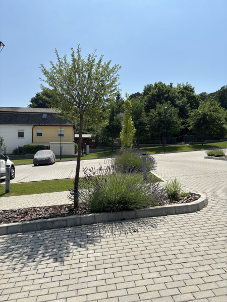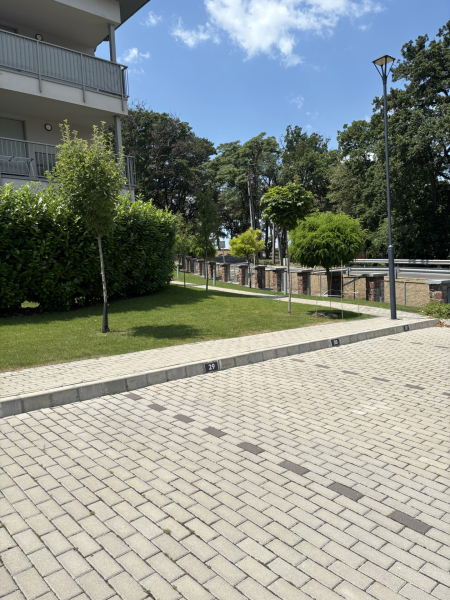A lakáshoz tartozik egy saját, kizárólagos használatú parkolóhely a társasház elektromos működtetésű kapuval védett udvarán.