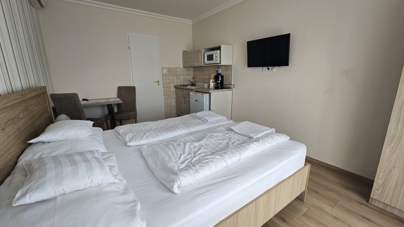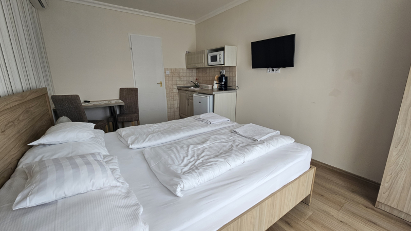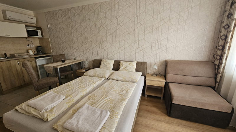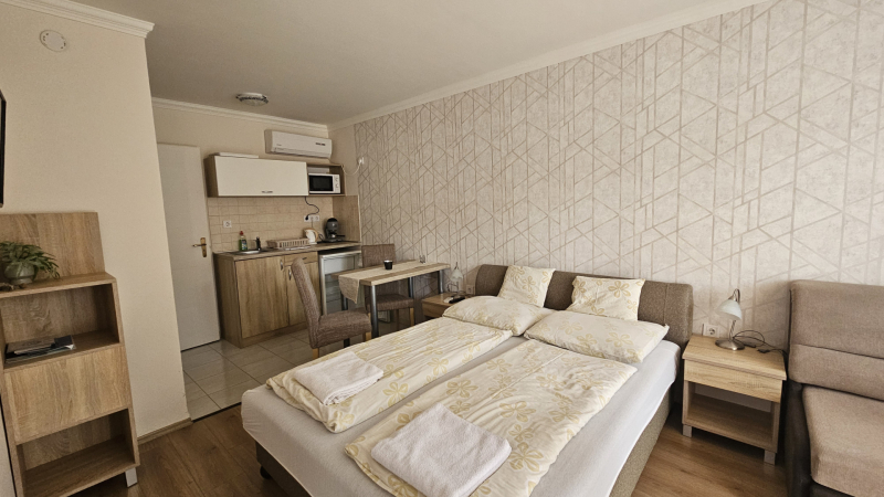 9 különálló apartman, mindegyikben saját konyha és zuhanyzós fürdőszoba, ízlésesen bútorozott, azonnal kiadható állapotban