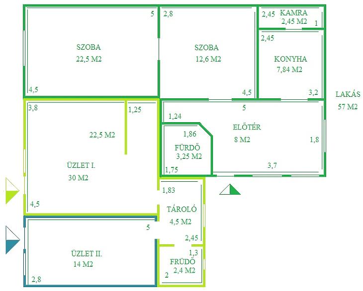 Téglaépítésű, 1 szintes, 2 utcai bejárattal rendelkező üzlethelyiség 15+30 m2-es. Tartozik hozzá egy 57 m2, felújítandó lakás, ahol konyha, 1+1 félszoba, fürdő és előtér került kialakításra. Egy 20 m2 tároló is rendelkezésre áll.