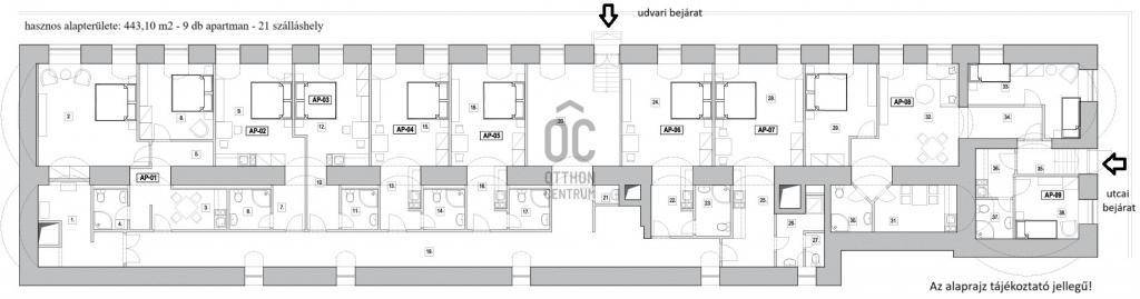 - 9 apartman (2 db 4 ágyas, 6 db 2 ágyas, 1 db 1 ágyas) saját fürdővel és konyhával = 21 férőhely