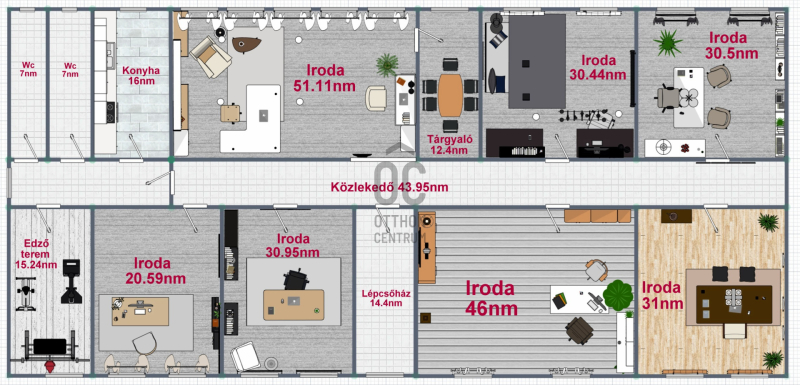Egy önálló kétszintes Irodaépület 1. emelete, amelynek összterülete: 375 nm (9 iroda, konyha, külön férfi-női mellékhelyiség, zuhanyzós fürdőszoba, konditerem. A helyiségek többsége légkondicionált, az irodák fűtését gázkazán biztosítja, amely meleg vízzel látja el a radiátorokat.