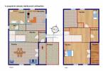 Az alsó szint 96m2-es alapterületű, alápincézett, a tetőtérben 75m2-es lakótér lett kialakítva.