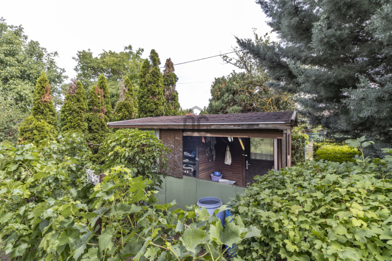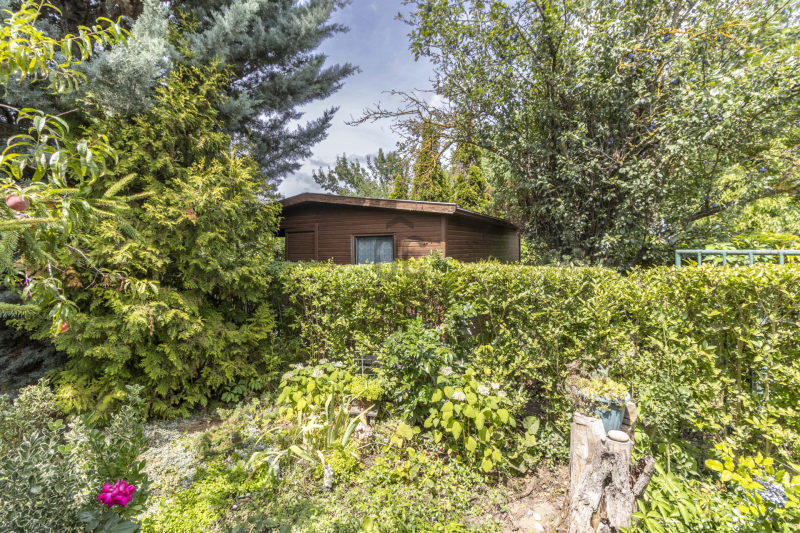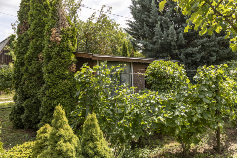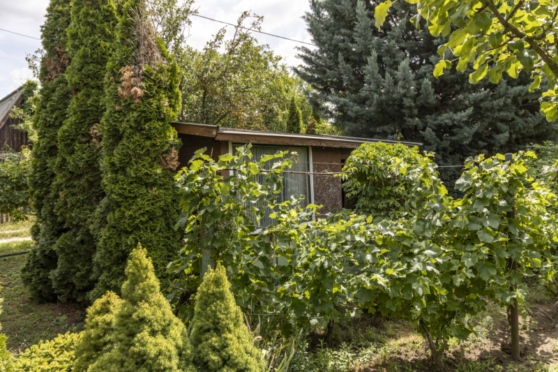 A terület elején egy 12 m²-es faház található, a hátsó részen egy pince és egy tároló van.