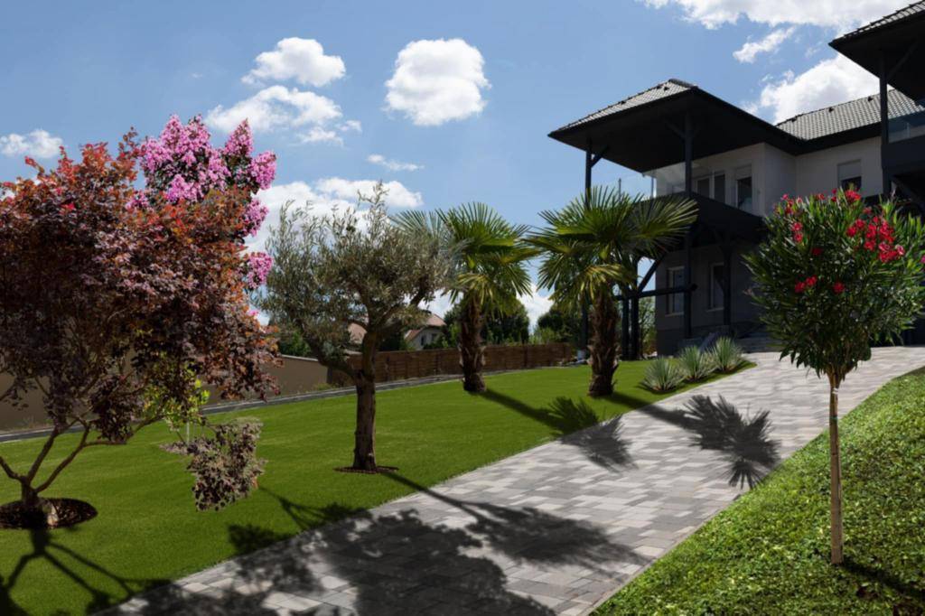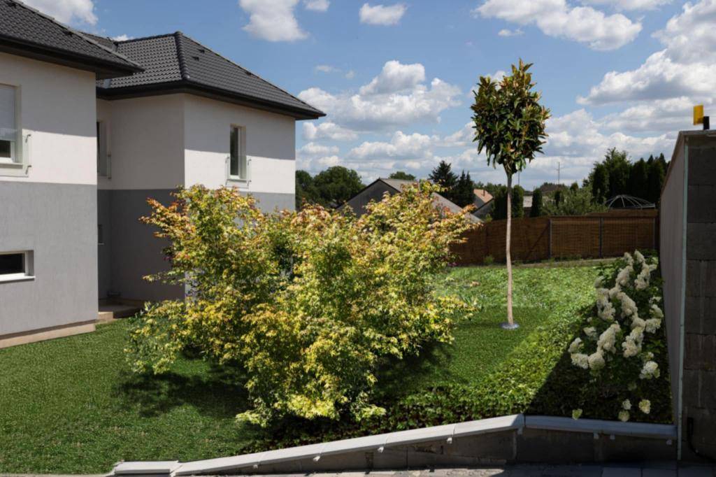 Az ikerház nettó 116 m² lakóterülettel rendelkezik, amelyhez tartozik egy 20 m²-es fedett terasz, valamint egy 20 m²-es fedett gépkocsi-beálló. A térkövezett felhajtón további autók parkolására is lehetőség van. A 500 m²-es saját használatú telek rendezett, tágas életteret nyújt.