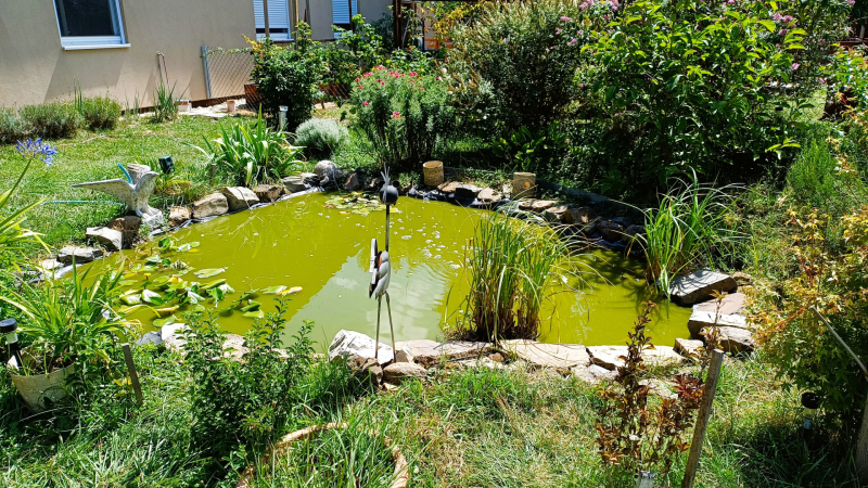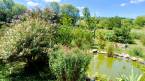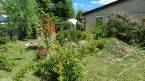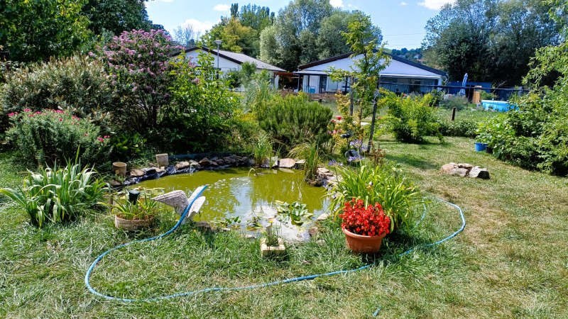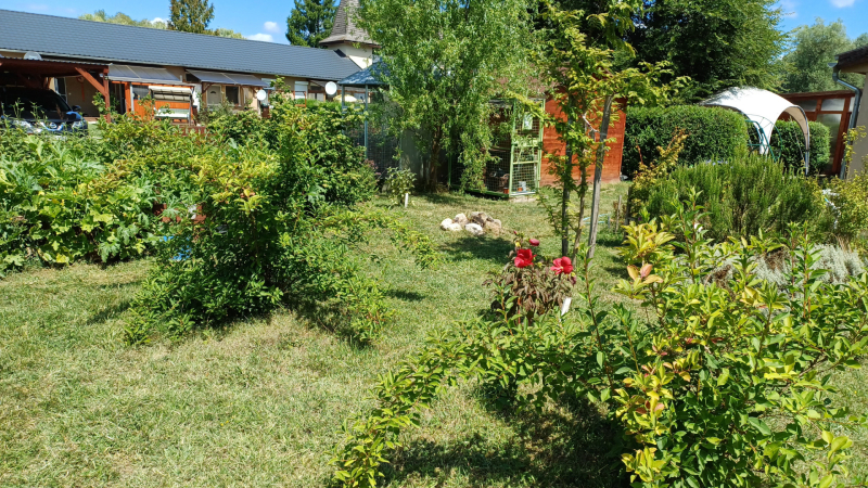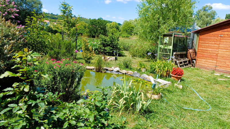 - A szemet gyönyörködtető kertben virágok, díszbokrok, halastó, sövénnyel szeparált sütögető.