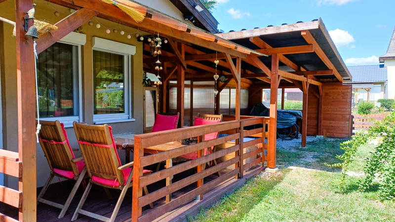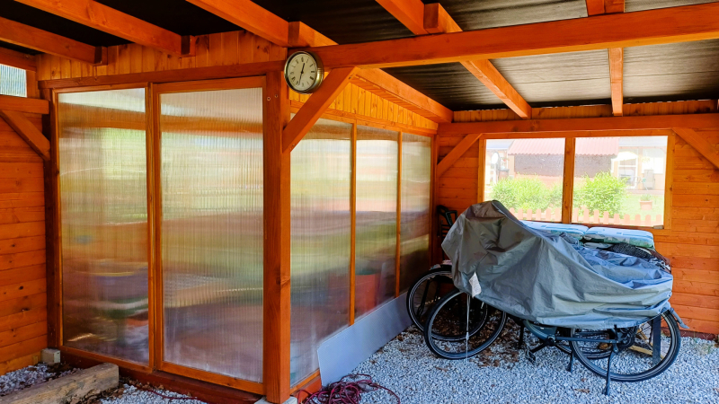- Színvonalasan kivitelezett famunkával készült megnagyobbított fedett terasz, autó-, kerékpár beálló, télikert, kerti tároló.