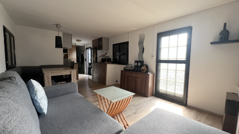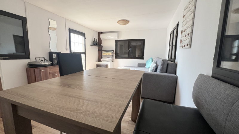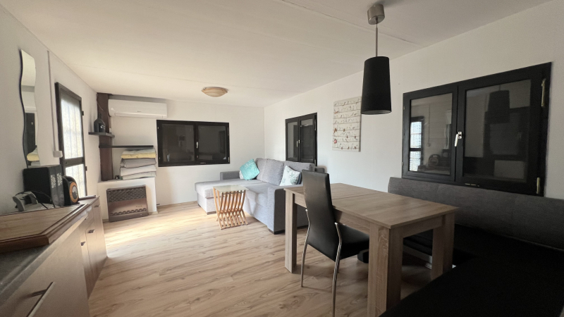 A klimatizált mobilházra a közművek közül a víz, szennyvíz, villany / új mérőórával/, rá van csatlakoztatva, gáz a telken belül található, teljesen felszerelt konyhával rendelkezik /Hűtő, tűzhely, mikró, mosógép, stb./ nappali-étkezője bútorozott.
