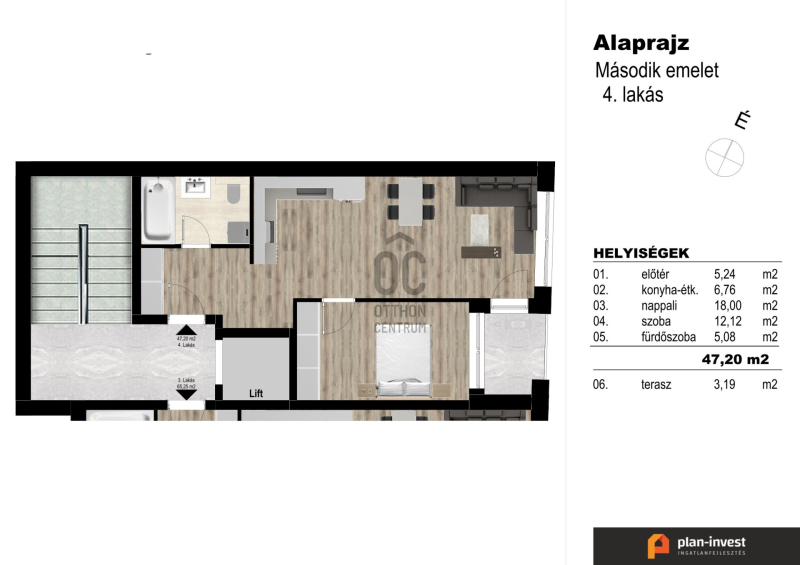 47 m2 alapterületű + 3 m2 erkély tartozik hozzá.
