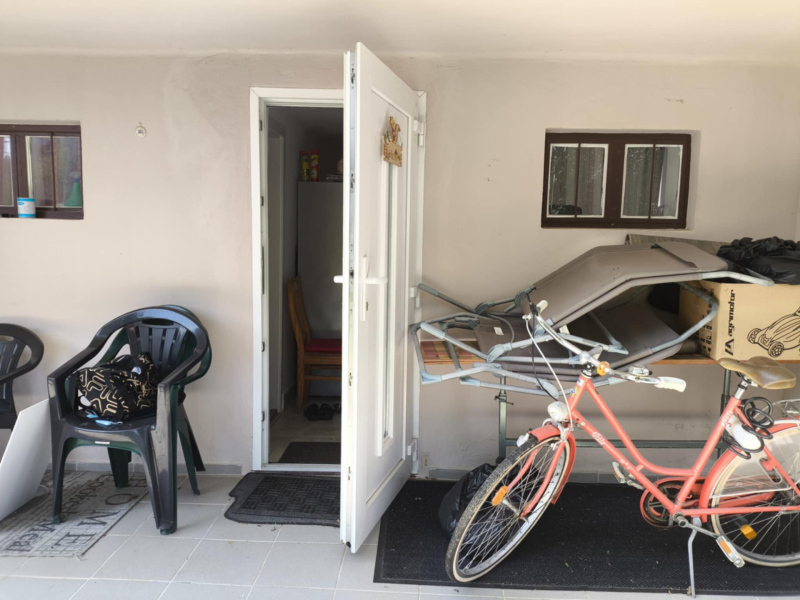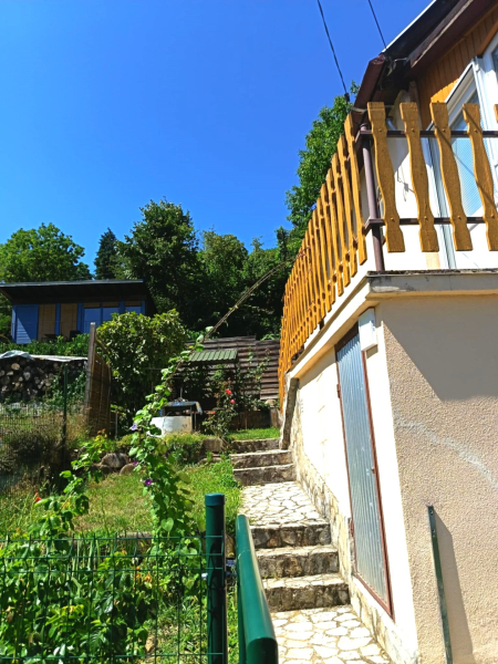 A körbekerített területre lépcsők vezetnek fel, a kis udvarban van néhány gyümölcsfa, málna, paradicsom, és füves terület a pihenéshez, napozáshoz, vagy egy kis medence is elfér. Vezetékes víz rendelkezésre áll.