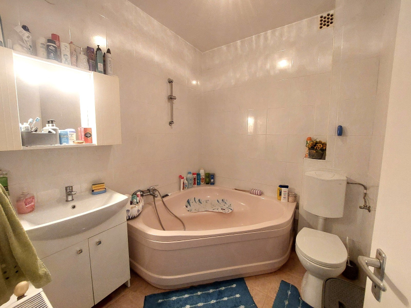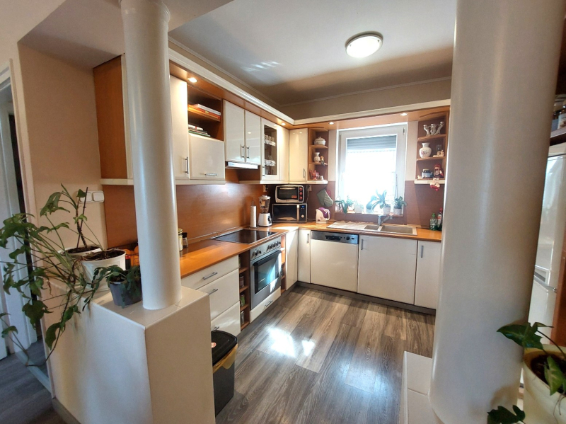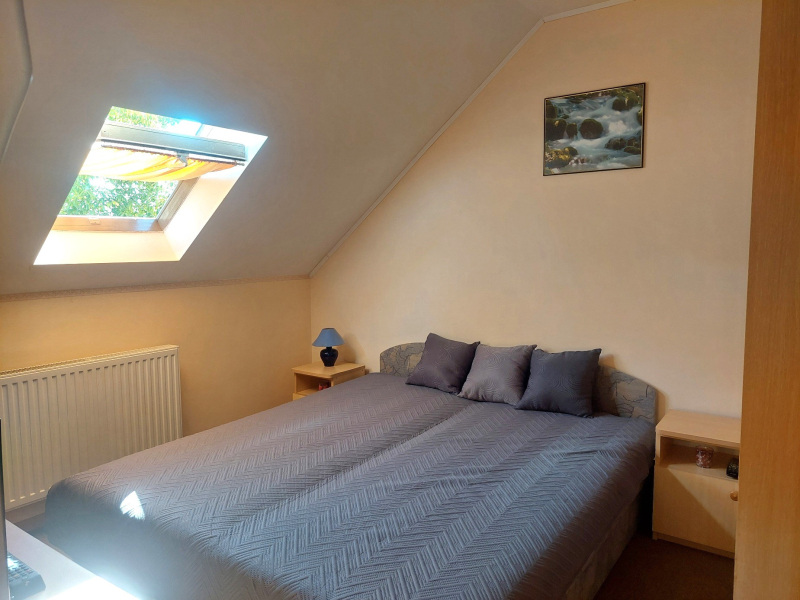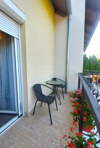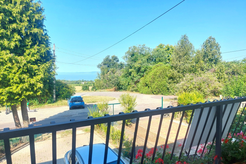 -első szinten fürdőszoba, amerikai konyhás nappali erkély kapcsolattal és gyönyörű panorámával a Balatonra