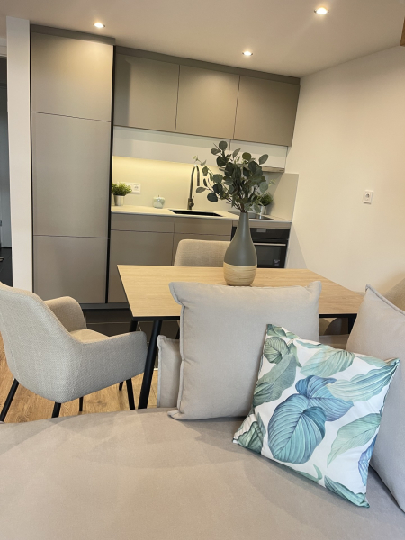 Az ízlésesen tervezett egyedi konyhában helyet kapott egy mosogatógép, indukciós főzőlap, sütő-mikró, beépített hűtő-fagyasztó is.
