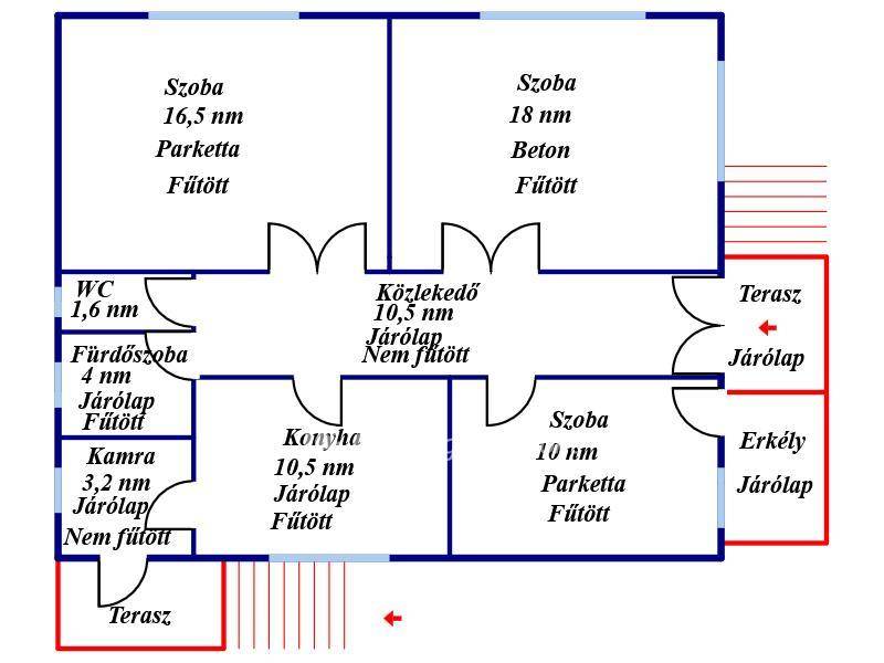 A kiváló statikai állapotú családi ház azonnal beköltözhető állapotban van, a szobák parkettásak illetve padlószőnyegesek, a többi helyiség járólapos, nyílászárói dupla üvegezéssel fából készültek, meleg víz ellátásáról villanybojler, fűtéséről gázkonvektorok és a konyhában található öntöttvas kályha gondoskodik. Eredetileg a pincében elhelyezett vegyes tüzelésű kazán, hőlégbefúvós rendszerrel fűtötte ki a lakást, az utóbbi években ezt nem használták, de bármikor újból üzembe lehet helyezni!