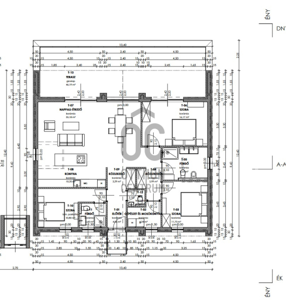 Tágas elrendezés: Nappali, 3 hálószoba, 2 fürdőszoba, gardrób, mosókonyha