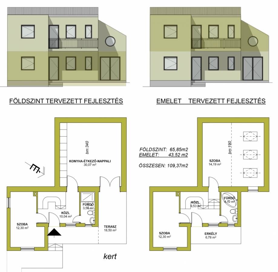 Az épület Lke-2/BT/2 övezeti besorolású, ami 20 % beépíthetőséget és 6m homlokzatmagasságot enged. A mellékelt fejlesztési terv a szoba feletti tetőtér beépítésével, és a többi épületrész emeletráépítésével egy korszerű négy szobás 110m2-es családiház kialakítását javasolja.