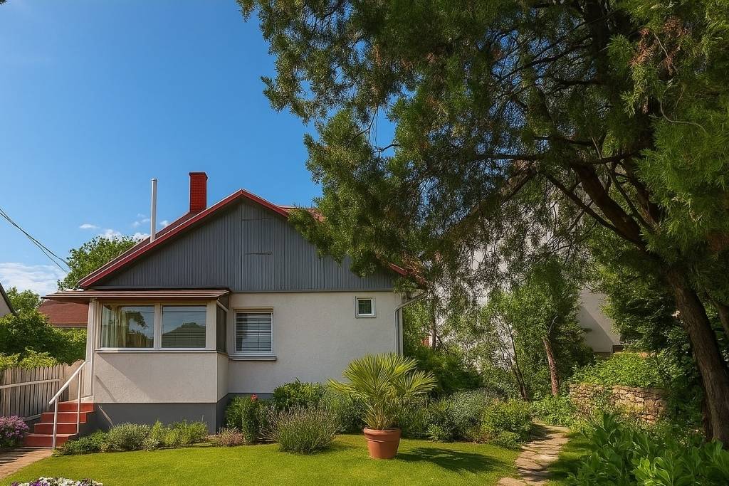 A 440 m2-es hangulatos kert 11 méteres utcafronttal bír. Az utcán saját parkolóhely, a kertben autóbeálló található. Az ingatlan megközelítése és használata független a szomszédoktól. Az utca csendes, kis forgalmú.