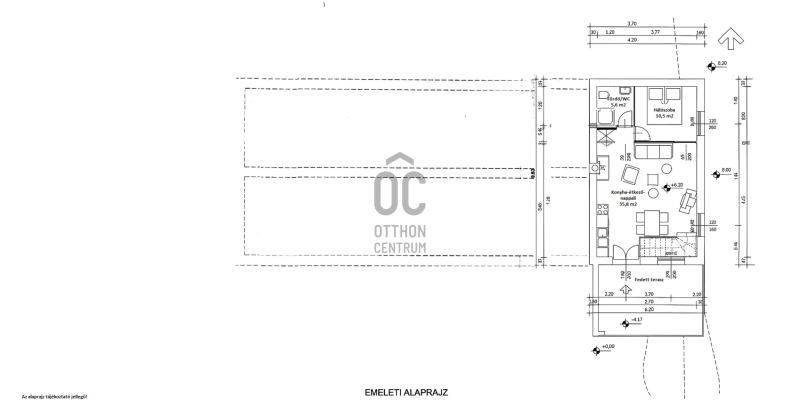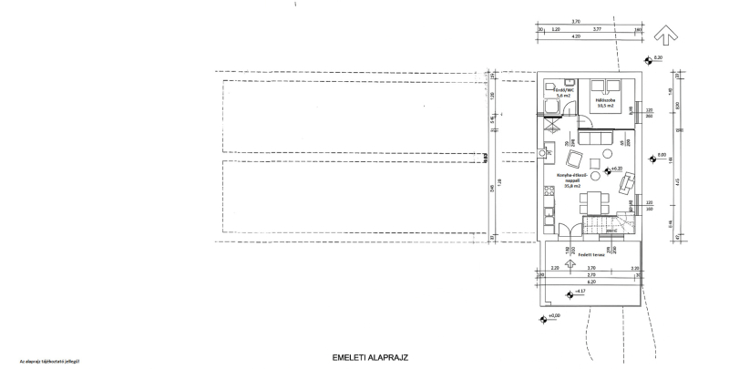A felső szinten egy 52 m2-es lakrész került kialakításra: nappali-konyha-étkezővel, hálószoba, fürdőszoba/WC, illetve egy nagy terasszal.