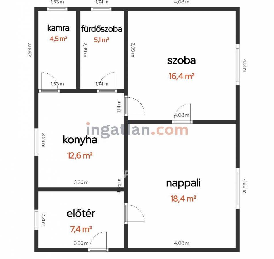Helyiségek: nappali, szoba, konyha, fürdőszoba, kamra
