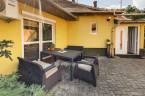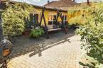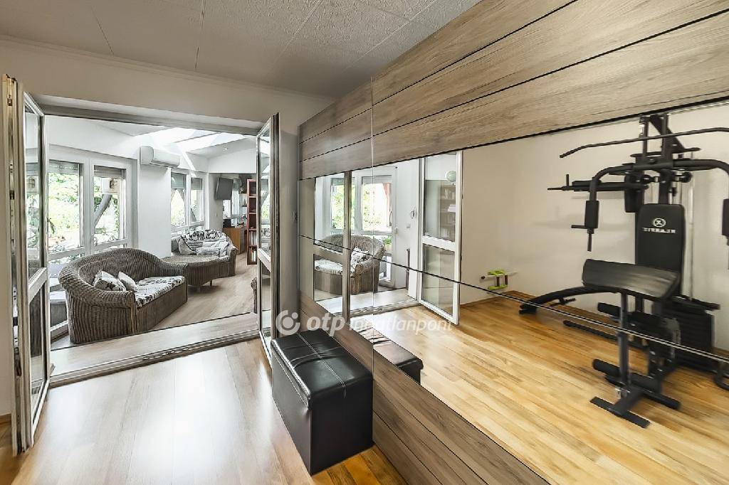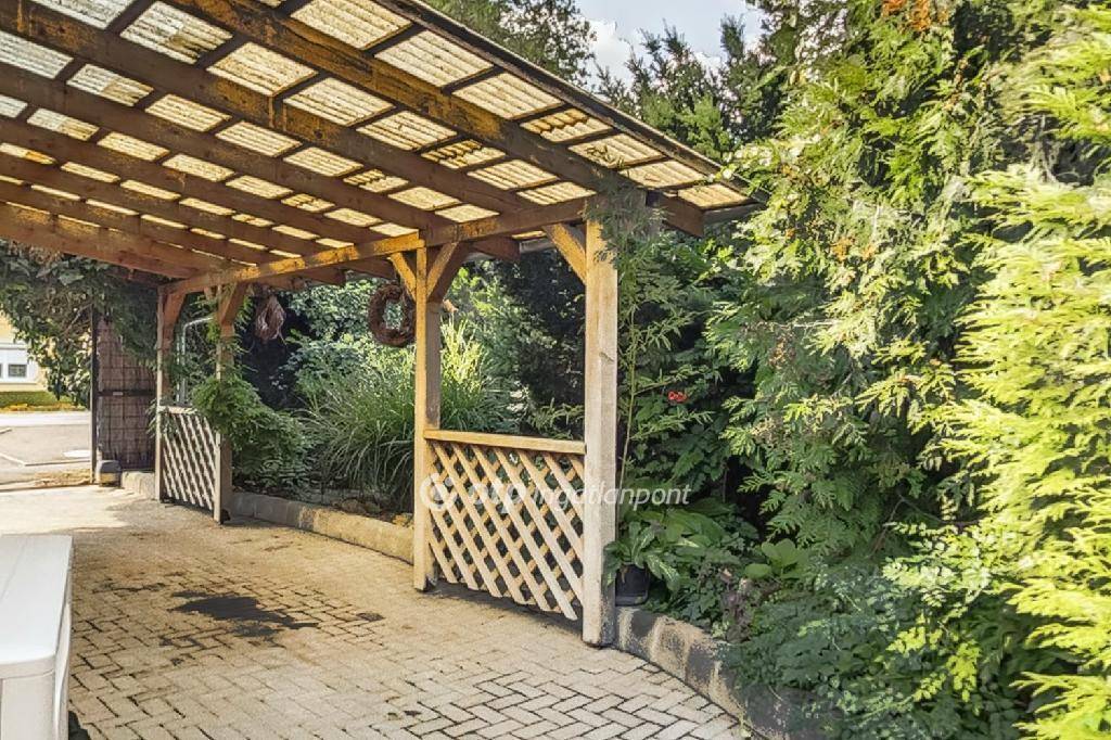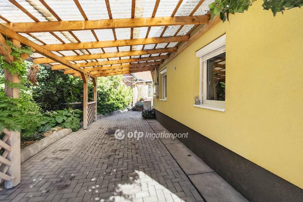 Parkolásra az udvaron egy 50m2-es fedett kocsibeálló alatt, elektromos Hörmann garázsajtón keresztül, vagy a ház előtt kialakított 100m2-es aszfaltozott parkolóban van lehetőség. A térkövezett udvaron kerti zuhany, pihenők lettek kialakítva, de az esővíz elvezetése és hasznosítása is megoldott összefolyók és gyűjtőtartályok segítségével.