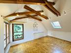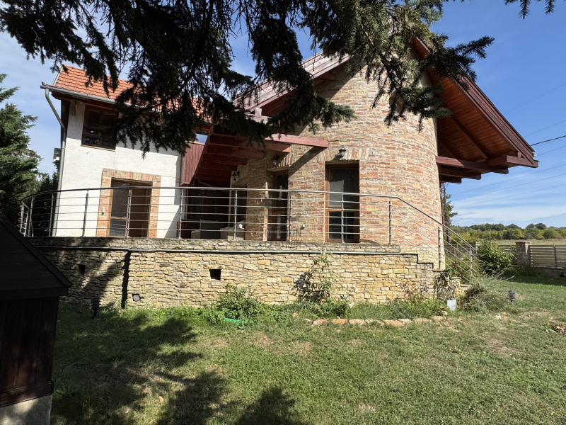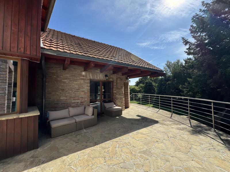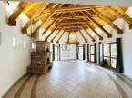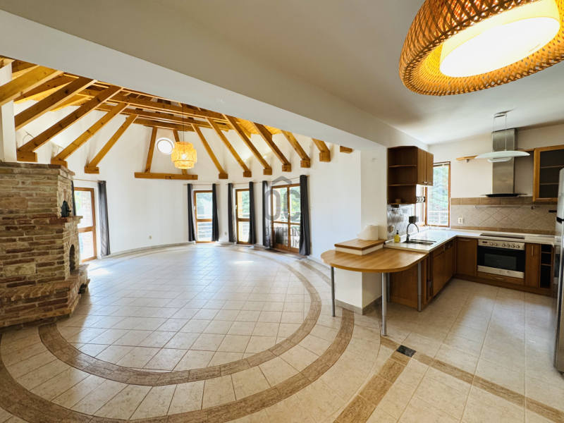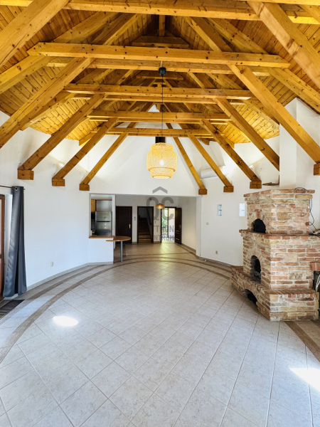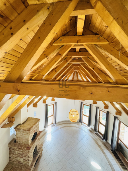 Első szint: a ház központi tere egy lenyűgöző, kb. 55 m²-es, nagy belmagasságú nappali, impozáns gerendákkal és hangulatos cserépkályhával, amelynek felső része pizzakemenceként is használható. A nappalihoz étkező és konyha kapcsolódik. Ezen a szinten két hálószoba és két fürdőszoba található.