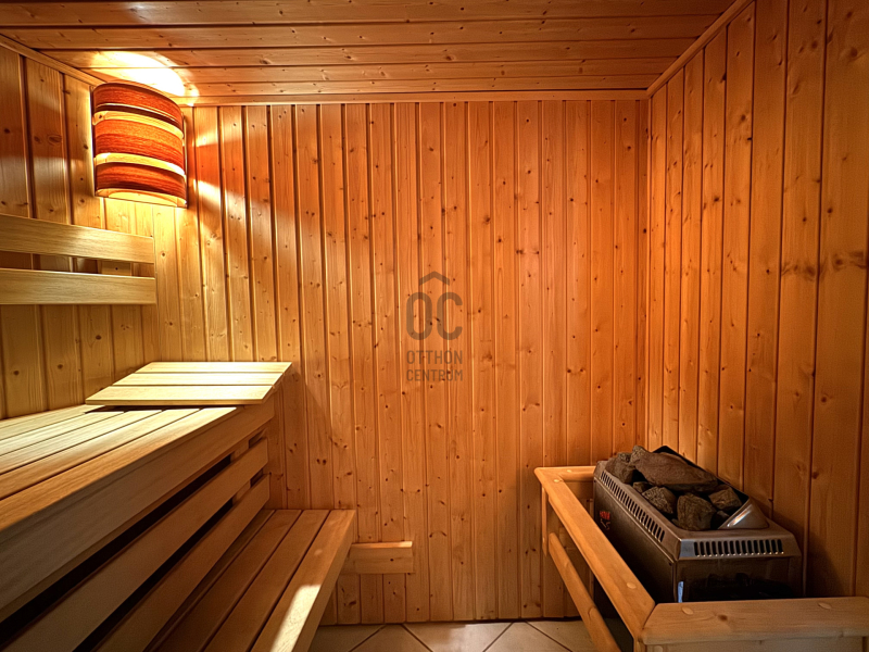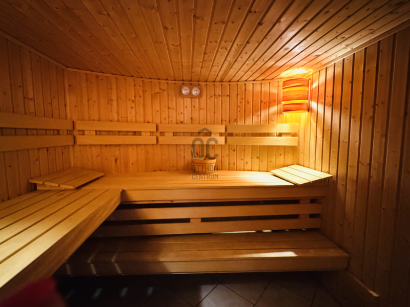Alsó szint: kiszolgáló helyiségek, új kazán, központi porszívó, mosókonyha, zuhanyzós fürdőszoba, valamint egy külön bejárattal rendelkező apartman – ideális többgenerációs együttéléshez vagy vendégek fogadására. Itt található továbbá egy kb. 30 m²-es wellness-részleg gyönyörű fény-szaunával és zuhanyzóval, illetve a háromállásos garázs is.