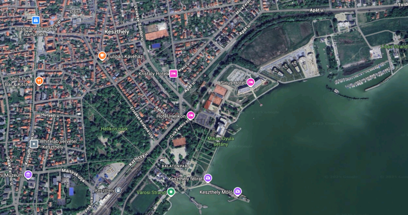 A jelenleg hotelként már nem üzemelő sarki épület, 2 percnyire Keszthely főterétől, illetve 500 m-re a Balatontól helyezkedik el.