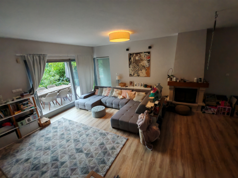 Az alsó szinten a tágas, világos nappaliból közvetlenül egy nagy kertkapcsolatos terasz előnyeit élvezhetjük. A kert több éves fákkal övezett területe teljes intimitást biztosít, ahol egy kerti medence felállítására is alakítottak ki helyet.