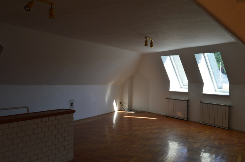 A fölső tetőtéri szint egylégterű, mely praktikusan dolgozónak, vagy gyerekek \\\"játszóterének\\\" is remekül használható.