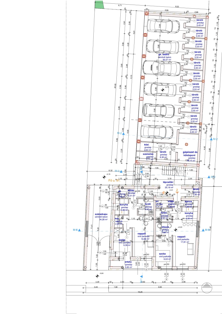 A társasház zárt, elektromos kapubeállóval ellátott udvarán kialakított felszíni beállóhely 2.500.000. Ft-ért, míg \\\"garázs\\\" és hozzá tartozó dupla méretű tároló helyiség 8.000.000.-Ft-ért vásárolható a lakásokhoz.