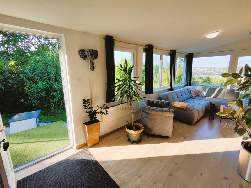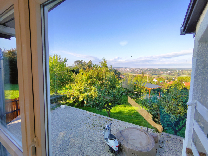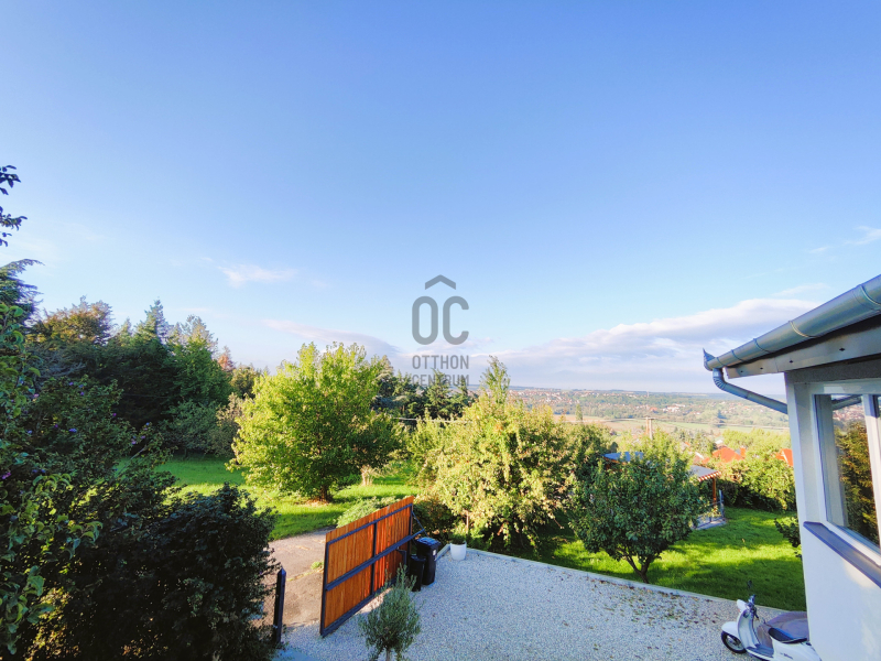 a külön kölső bejáraton megközelíthető felső szinten nagy panorámás nappali, étkező, konyha, fürdőszoba/WC illetve hálószoba és erkély kapott helyet.