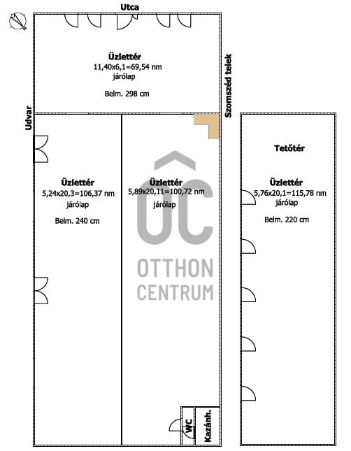 Makón a Tölgyfa utcában kínálunk hosszú távra kiadó, tetőteres üzlethelyiséget, amely összesen 400 nm hasznos területet kínál: 284 nm a földszinten, továbbá 116 nm tetőtérben. Négy tágas üzlettér, mellékhelyiség WC-mosdóval, kazánház és logisztikai kapcsolódási lehetőségek állnak rendelkezésre. A járólapos burkolatok praktikusak, az ablakok fából készültek – időnkénti karbantartást igényelhetnek –, a bejárati ajtó műanyag szerkezetű. A fűtést gáz központi rendszer biztosítja, az elektromos bekötés 32 A-ig alkalmas nagyobb terhelésre is. Az ingatlan minden további szükséges közművel ellátott: gáz, víz és csatorna bekötéssel. A tető, cseréppel fedett, szerkezete megbízható.