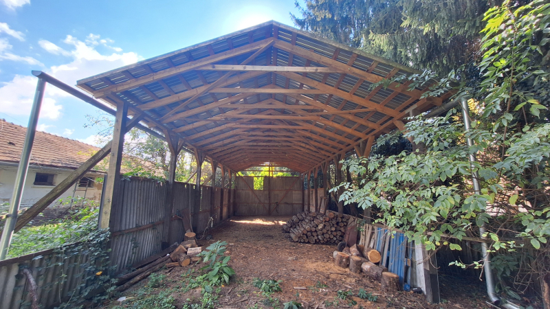 -fedett fa szerkezetű, cserép fedésű, nagy belmagasságú bálatároló
