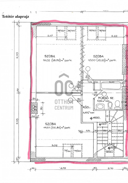 Tetőtér (76,5 m²): 2 nagy szoba, teakonyha, fürdőszoba