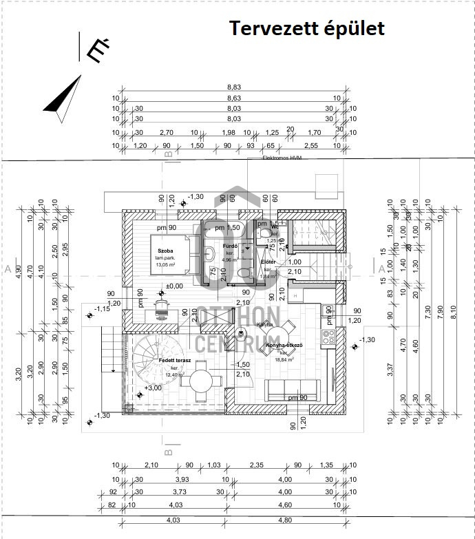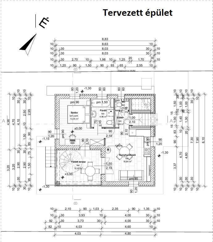 - Földszint: 39,94 m² – előtér, konyha-étkező, szoba, fürdő, WC