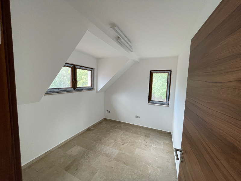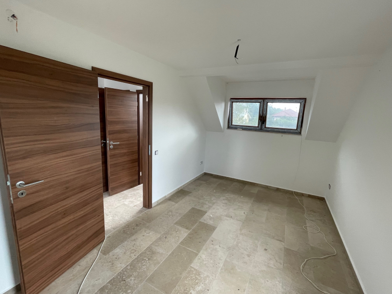 Helyiségei: a földszinten amerikai konyhás nappali, melyhez egy 21 m2-es és egy 12 m2-es terasz kapcsolódik, egy hálószoba, egy zuhanyzós fürdőszoba + WC, az emeleten pedig 1+2 hálószoba, háztartási helyiség és egy WC található.